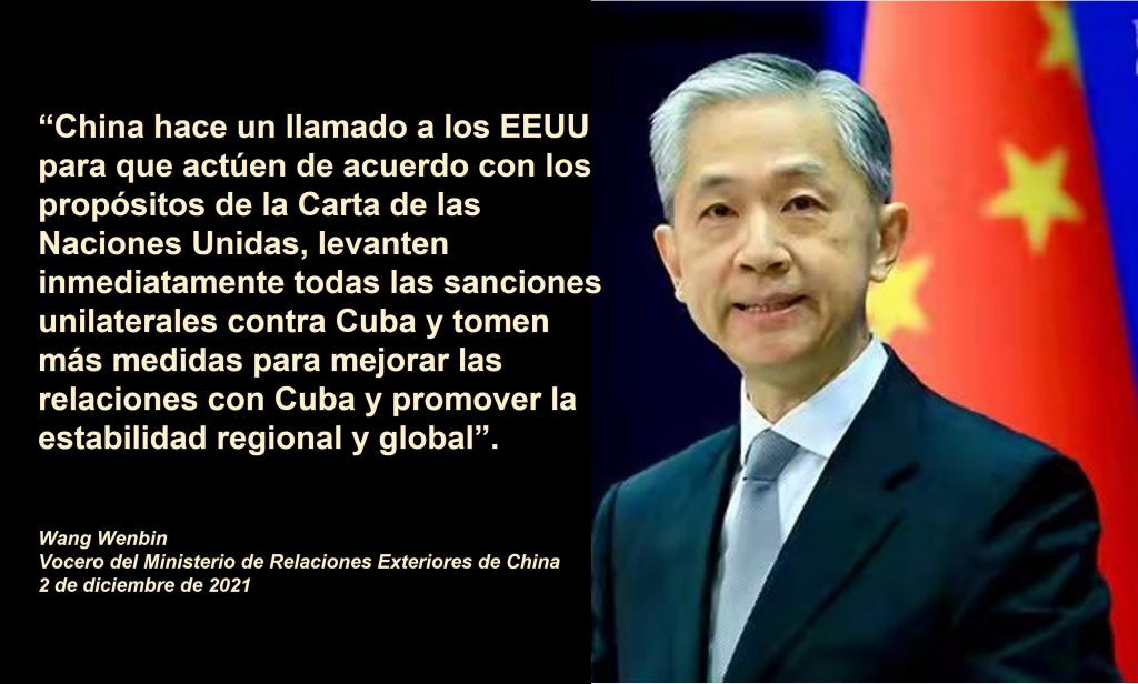 Beijing, 2 de diciembre de 2021- China manifestó hoy el rechazo a las recientes sanciones de Estados Unidos contra funcionarios de Cuba, las consideró una evidencia más de su actitud hegemónica y una violación a las normas básicas que rigen los vínculos internacionales.