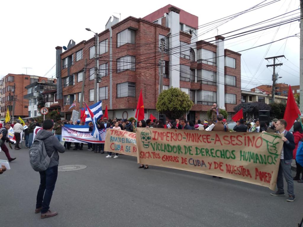 COLOMBIA, 21 de junio de 2019. Más de doscientas personas se congregaron ayer frente a la embajada de Estados Unidos en Bogotá para exigir al gobierno de Donald Trump el fin del bloqueo económico, comercial y financiero contra el pueblo cubano.
