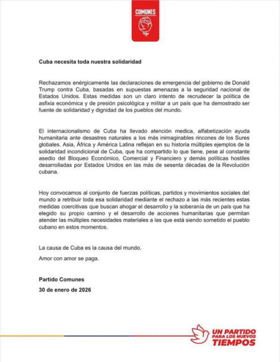 El partido Comunes emitió un pronunciamiento en el que rechaza enérgicamente las declaraciones de “emergencia” del gobierno de Donald Trump contra Cuba, calificándolas como una nueva escalada de la política de asfixia económica, presión psicológica y amenaza militar contra un país que ha hecho de la solidaridad y la dignidad un principio de Estado.