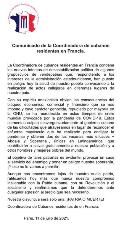 Comunicado de la Coordinadora de cubanos residentes en Francia