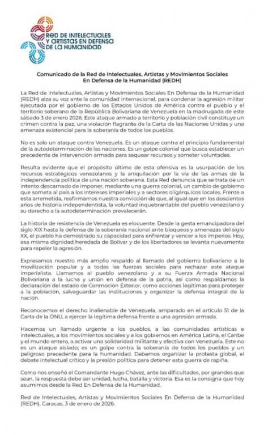 La Red de Intelectuales, Artistas y Movimientos Sociales en Defensa de la Humanidad (REDH) alza su voz ante la comunidad internacional para condenar la agresión militar ejecutada por el gobierno de los Estados Unidos de América contra el pueblo y el territorio soberano de la República Bolivariana de Venezuela en la madrugada de este sábado 3 de enero de 2026. Este ataque armado a territorio y población civil constituye un crimen contra la paz, una violación flagrante de la Carta de las Naciones Unidas y una amenaza existencial para la soberanía de todos los pueblos.