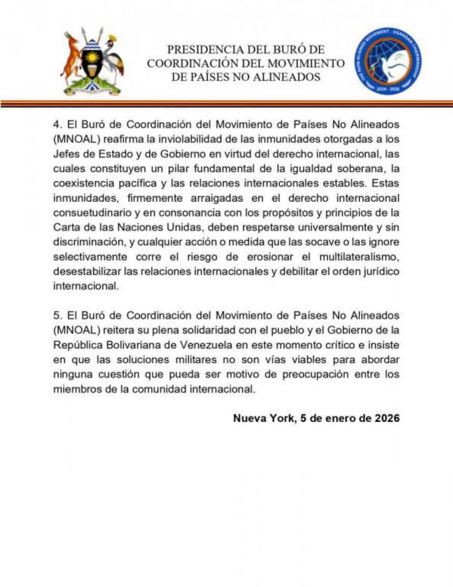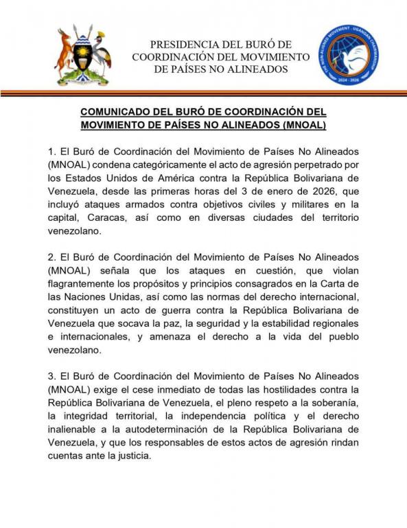 Puerto Príncipe, 6 de enero 2026.-Comunicado del Movimiento de Países No Alineados (MNOAL) condena categóricamente el acto de agresión perpetrado por el gobierno de los Estados Unidos de América contra la República Bolivariana de #Venezuela, que incluyó ataques armados contra objetivos civiles y militares en la capital, Caracas, así como en diversas ciudades del territorio venezolano.(CUBAMINREX/EMBACUBA HAITI)
