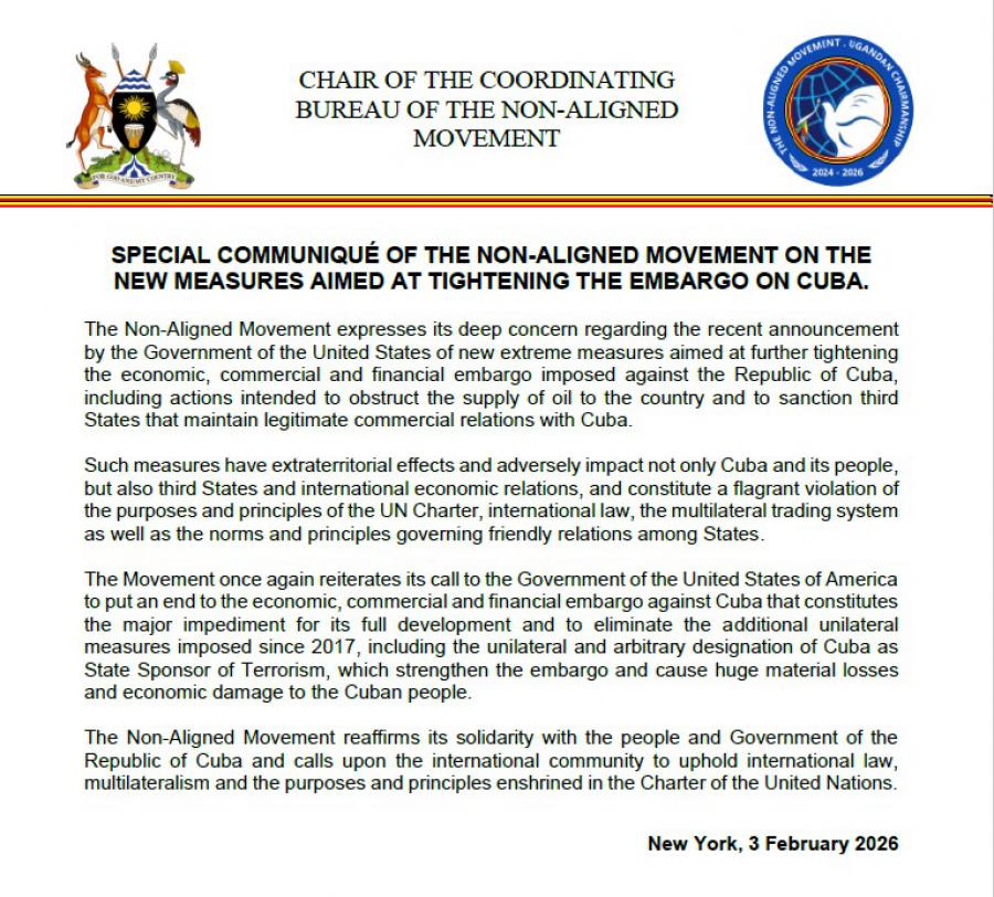 El Movimiento de Países No Alineados reafirma su solidaridad con el pueblo y el Gobierno de la República de Cuba y exhorta a la comunidad internacional a que defienda el derecho internacional, el multilateralismo y los propósitos y principios consagrados en la Carta de las Naciones Unidas.