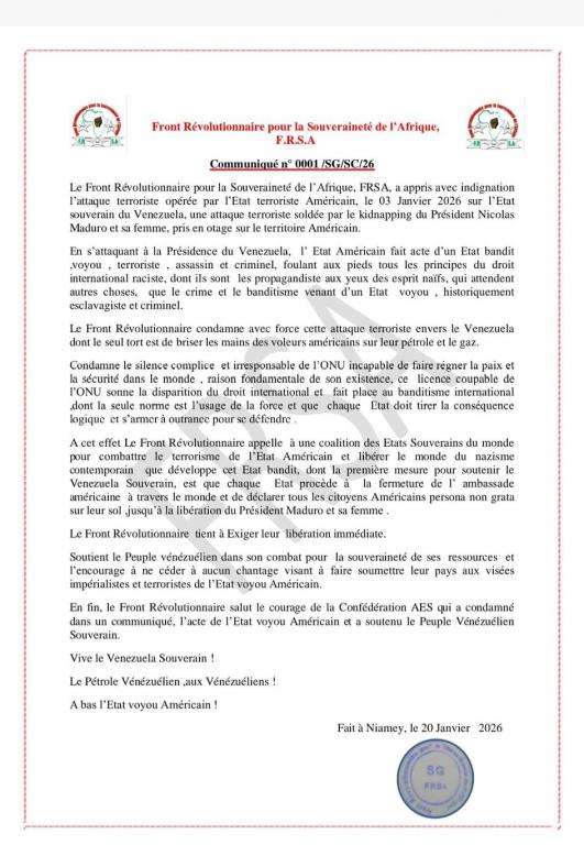 El Frente Revolucionario por la Soberanía de África, FRSA, se enteró con indignación del ataque terrorista llevado a cabo por el Estado terrorista Americano, el 3 de enero de 2026 sobre el Estado soberano de Venezuela, un ataque terrorista saldado por el secuestro del Presidente Nicolás Maduro y su esposa, Tomado como rehén en territorio americano.
