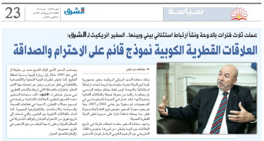 (Doha, 22 de octubre de 2025) – El embajador cubano en Qatar, Enrique Enríquez, concedió una entrevista exclusiva al Diario Al Sharq, al celebrarse próximamente el aniversario 36 del establecimiento de relaciones diplomáticas entre Cuba y Qatar.