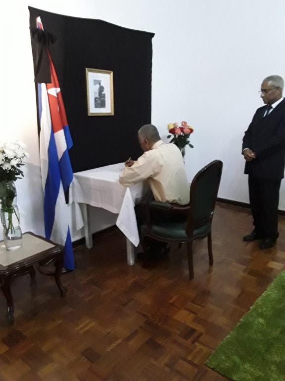 El Mayor General Anildo Morais, Jefe de Estado Mayor de las Fuerzas Armadas de Cabo Verde; la Presidenta del PAICV Janira Hopffer Almada y miembros de la dirección del partido; Ana María Cabral, viuda de Amílcar Cabral; miembros de la Asociación de Combatientes por la Liberación de la Patria; Josefa Coelho da Cruz, Embajadora de Angola; Boris Kurdyumov, Embajador de Rusia y Decano del Cuerpo Diplomático; funcionarios diplomáticos de las embajadas de Angola y Senegal, Filiberto Vieira, Diputado Nacional del PAICV y miembro del Grupo de Amistad Parlamentario Cuba-Cabo Verde, acudieron a la Embajada de Cuba en Cabo Verde para firmar el libro de condolencias por el fallecimiento del Comandante en Jefe de la Revolución Cubana Fidel Castro Ruz, y expresar sus pésames y homenaje al Comandante en Jefe.