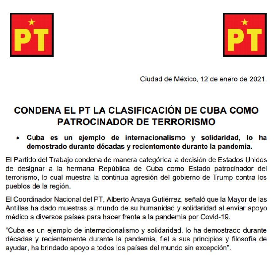 El Partido del Trabajo condena de manera categórica la decisión de Estados Unidos de designar a la hermana República de Cuba como Estado patrocinador del terrorismo, lo cual muestra la continua agresión del gobierno de Trump contra los pueblos de la región.