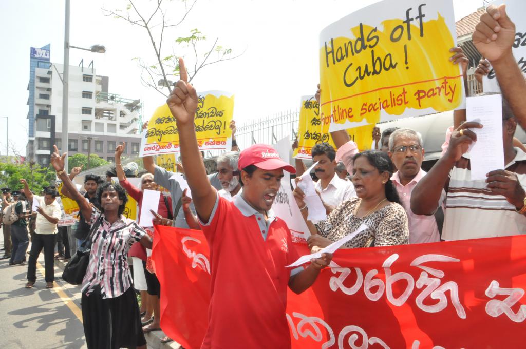 SRI LANKA, 17 de octubre de 2017.- Convocados por el Partido Línea del Frente Socialista, un amplio grupo de amigos de Cuba se concentraron en la mañana de hoy frente a la sede de la Embajada de los Estados Unidos en Colombo, exigiendo el inmediato levantamiento del bloqueo impuesto a Cuba por el gobierno norteamericano, desde hace más de 50 años.