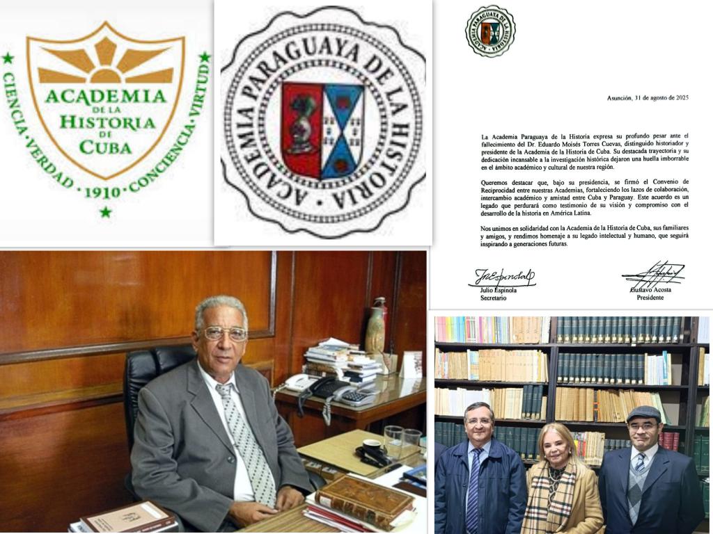 Asunción, Paraguay. La Academia Paraguaya de la Historia (APH) emitió un mensaje de condolencias por el fallecimiento del presidente de la Academia de la Historia de Cuba (AHC), Dr. Eduardo Torres-Cuevas. Su homólogo paraguayo, Dr. Gustavo Acosta Toledo, al expresar su sentido pésame familiares y colegas de trabajo, resaltó su amplio curriculum profesional y los aportes en el ámbito cultural y académico de nuestra región. El Secretario de la APH, Julio Espínola, informó que en la próxima sesión de la organización se le hará un acto solemne de recordación.