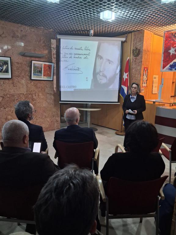 El encuentro, enmarcado en las actividades por el Centenario del Comandante en Jefe Fidel Castro, inició con una evocación del histórico discurso en el que, en el primer año de la Revolución, Fidel ya definía que: “El futuro de nuestra patria tiene que ser necesariamente un futuro de hombres de ciencia, tiene que ser un futuro de hombres de pensamiento…”. La Embajadora, Juana Martínez González, en sus palabras a los presentes, subrayó que esta sentencia marcaría toda una estrategia de desarrollo de capacidades científicas y de investigación, que ayudarían al país a superar numerosos escollos a lo largo de la historia revolucionaria, sobre todo en las condiciones de la Isla, sometida a una brutal guerra económica durante más 60 años por parte del gobierno de Estados Unidos. Citó como ejemplo la lucha contra la pandemia de COVID-19, donde gracias a la visión de futuro del Comandante, existían capacidades investigativas y de producción que contribuyeron a la creación de 5 candidatos vacunales y de 2 vacunas que posibilitaron la inmunización de un pueblo entero y evitar la pérdida de innumerables vidas humanas; sobre todo porque por la política de bloqueo estadounidense, Cuba no podría tener acceso a las vacunas que se comercializaban en el mundo. Destacó, además, que todo ese conocimiento se desarrolló en aras también de preservar la paz, el sueño dorado de la humanidad que está actualmente en peligro, y subrayó que a ese objetivo debería estar dirigido el trabajo de la comunidad científica mundial, en la búsqueda y preservación de la paz, justo en un momento en que esta se ve más amenazada que nunca.