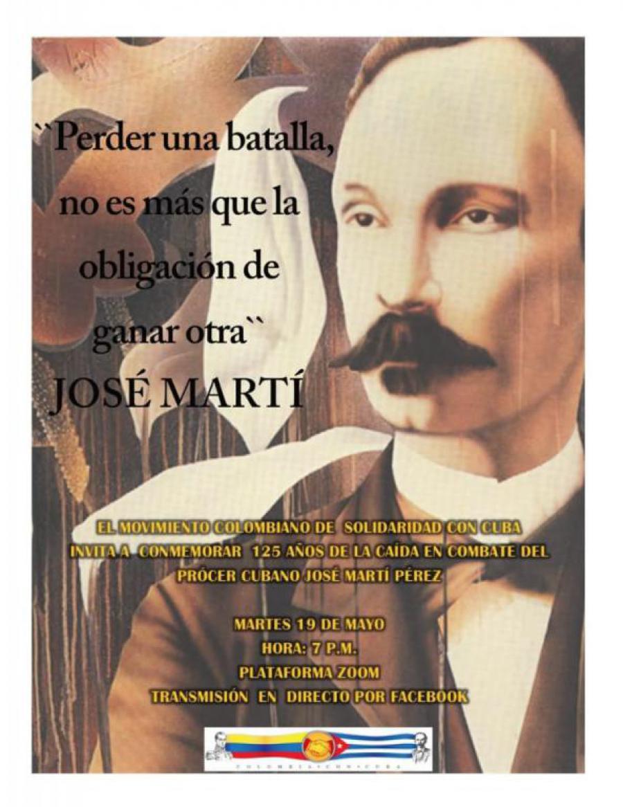 COLOMBIA, 20 de mayo de 2020. En una emotiva reunión virtual, el Movimiento Colombiano de Solidaridad con Cuba y la Asociación de Cubanos Residentes en Colombia conmemoraron ayer el 125 aniversario de la caída en combate de José Martí.