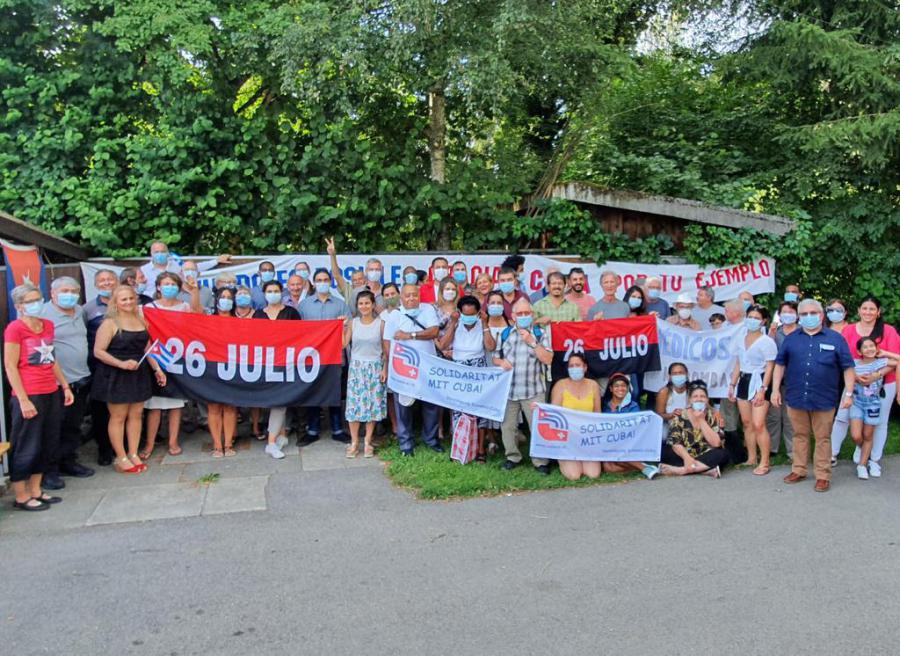 Berna, 26 de julio de 2020.- La víspera del Día de la Rebeldía Nacional, amigas y amigos de Cuba en Suiza y cubanos residentes se dieron cita en Berna para recordar la fecha y también el cumpleaños 94 del Líder Histórico de la Revolución Cubana, Comandante en Jefe Fidel Castro Ruz, a conmemorarse el próximo 3 de agosto, con una jornada político-cultural organizada por la Asociación Suiza-Cuba y la Embajada cubana.