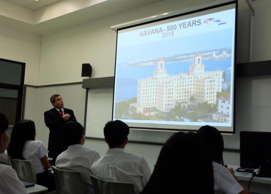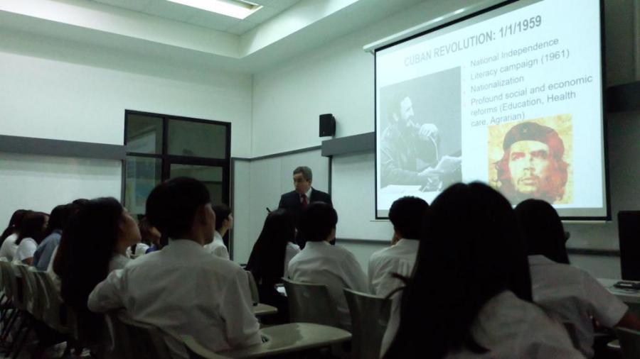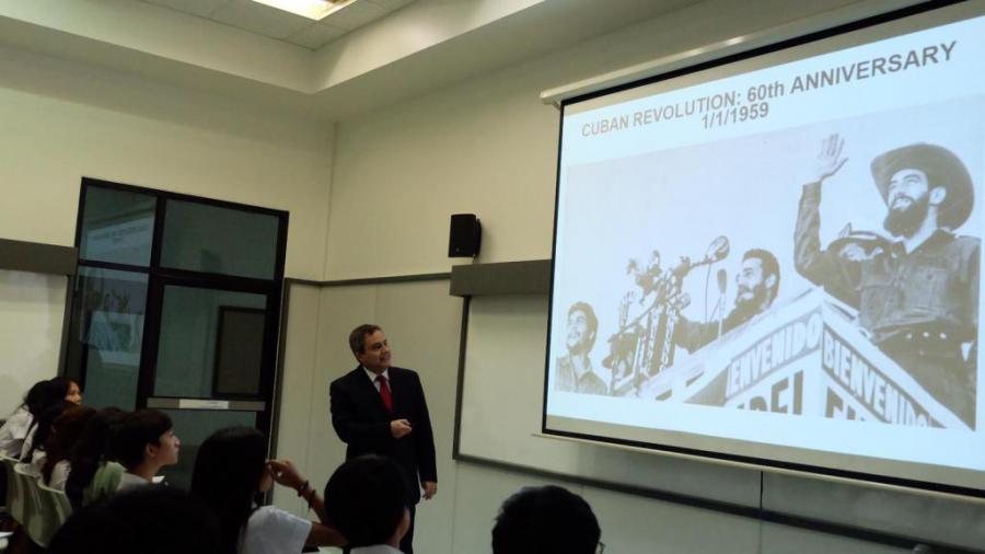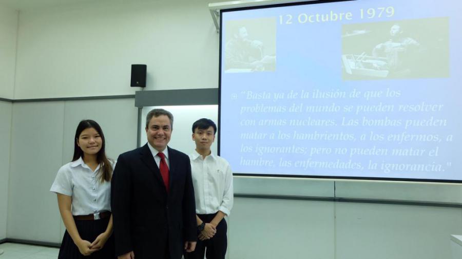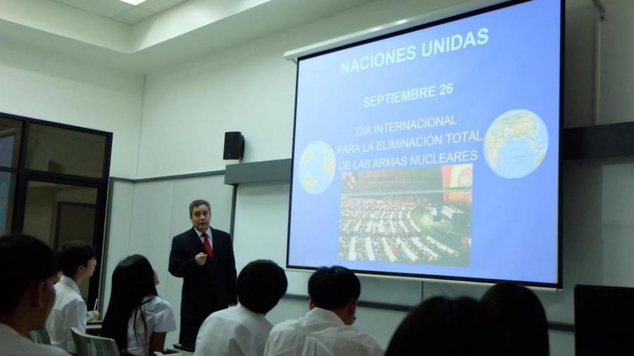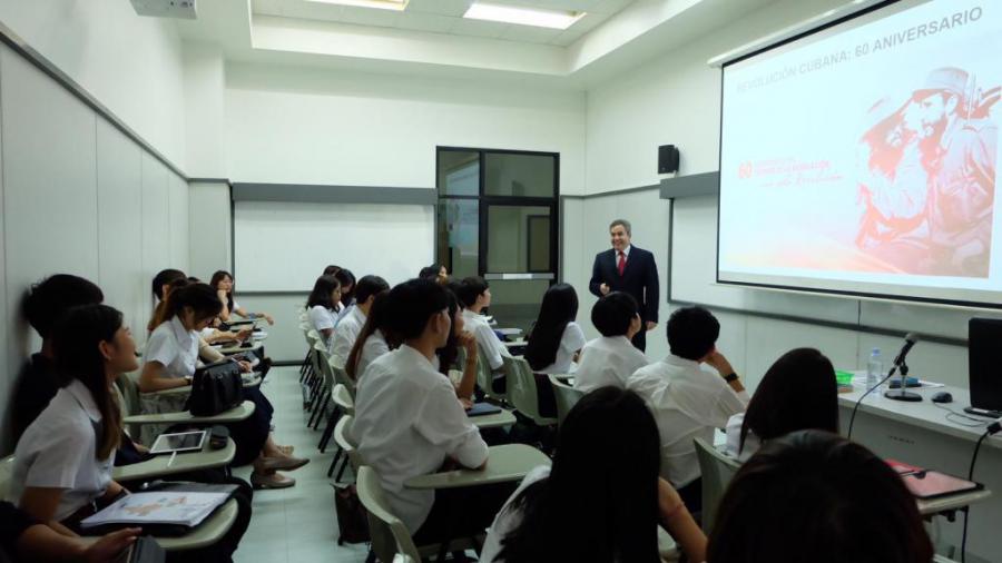 BANGKOK, 25 de septiembre de 2019.- El embajador de Cuba ante el Reino de Tailandia, Héctor Conde Almeida, impartió conferencia en la “Universidad Chulalongkorn” en conmemoración del 26 de septiembre como Día Internacional para la Eliminación Total de las Armas Nucleares, designado por la Organización de Naciones Unidas (ONU) en 2013. La presentación contó con la participación estudiantes de la Sección de Español de la facultad de Artes y del Centro de Estudio de Latinoamérica de la Universidad, directivos y profesores de la prestigiosa institución.
