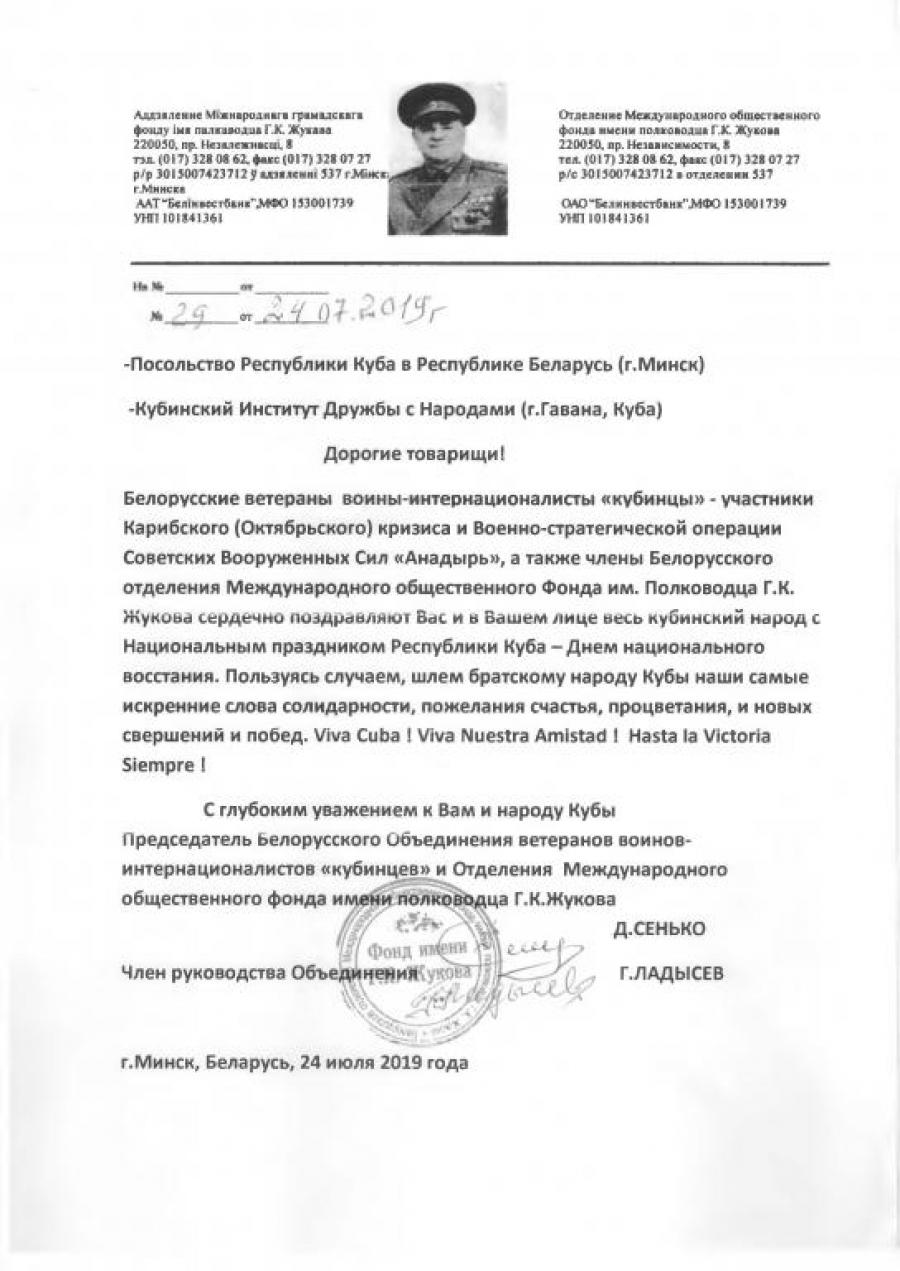(Minsk, 25 de julio) En ocasión del aniversario 66 del Asalto al Cuartel Moncada, fue realizado en la sede de la Embajada de Cuba en Belarús un encuentro entre los trabajadores de la misión y miembros de la Asociación belarusa de veteranos combatientes internacionalistas «cubanos» y la Sección del Fondo Social Internacional “G.K. Zhúkov”, en el cual, su Presidente, Dmitriy Senkó, dio lectura a una Carta de Felicitación por tan memorable fecha.