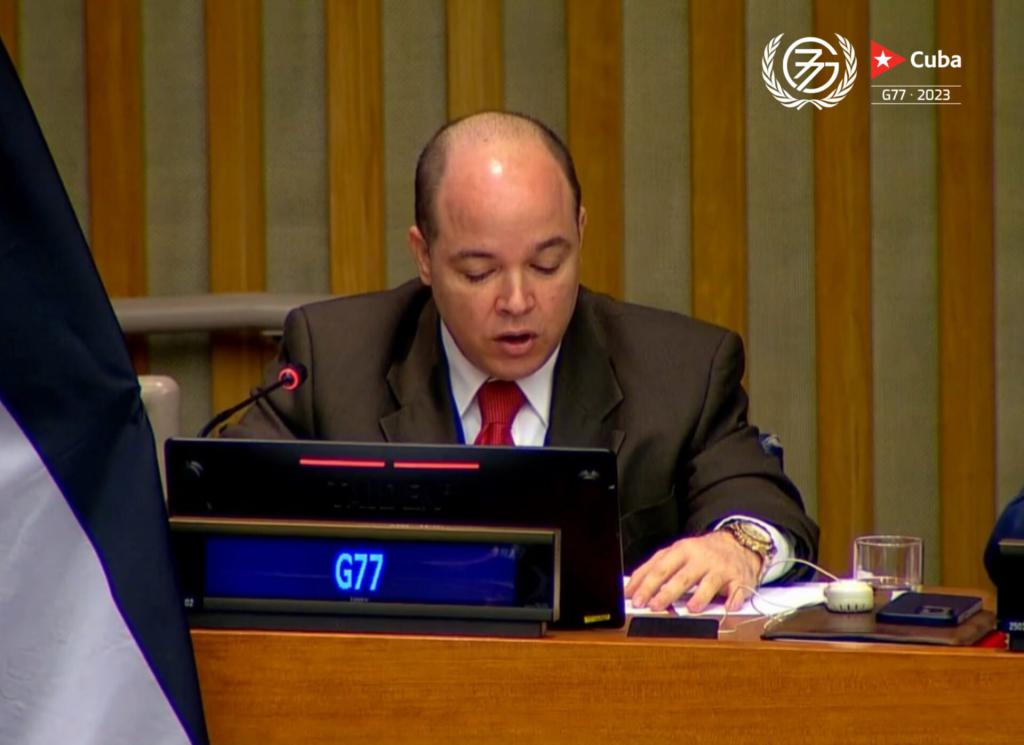 El embajador y representante permanente alterno de Cuba ante las Naciones Unidas, Yusnier Romero Puentes realizó esta declaración en nombre del G77 y China en reunión de alto nivel que contó con la presencia de Mahmud Abbas, presidente de la Autoridad Nacional Palestina.