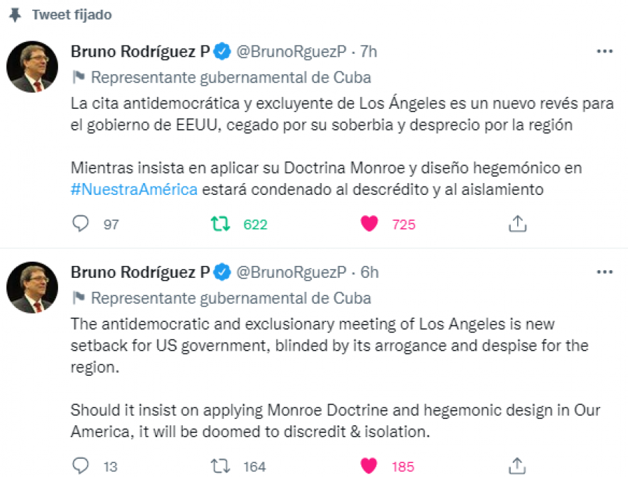 En su cuenta de Twitter, el ministro de Relaciones Exteriores expresó que “la cita antidemocrática y excluyente de Los Ángeles es un nuevo revés para el gobierno de EEUU, cegado por su soberbia y desprecio por la región”.