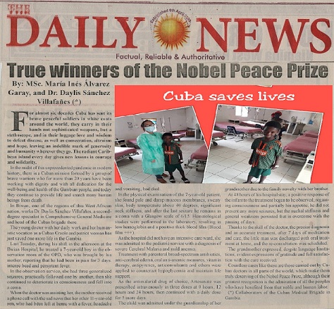 Banjul, 14 sept.- Los profesionales de la salud cubanos que laboran en Gambia, y los que lo hacen en numerosas naciones del mundo, fueron considerados verdaderos merecedores del Premio Nobel de la Paz, en un artículo publicado hoy a media página en el diario gambiano Daily News.