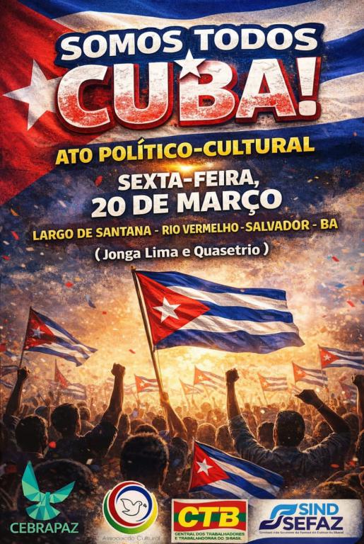 Brasilia, 20 de marzo de 2026. Continúan las manifestaciones de apoyo a Cuba en Brasil, con la organización hoy de un Acto Político Cultural, en la ciudad de Salvador de Bahía, convocado por el Centro Brasileño de Lucha Por la Paz (Cebrapaz); La Asociación Cultural José Martí de Bahía y la Central de Trabajadores de Brasil (CTB); entre otras organziaciones locales. La actividad se suma a las acciones de respaldo a la isla y condena a la agresión económica de los EUA contra el pueblo cubano, que han estado ocurriendo las últimas semanas en varias ciudades brasileñas.