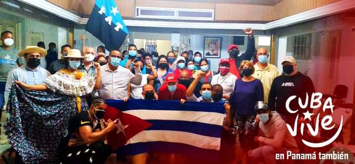 Panamá, 16 de noviembre. La lluvia no impidió que una diversa representación de agrupaciones sociales, estudiantiles, sindicales, miembros de la Coordinadora Nacional de Solidaridad con Cuba y de la Asociación de Cubanos Residentes en Panamá, llegaran esta tarde hasta la Embajada de la nación caribeña, para continuar los festejos, en el marco de la jornada #CubaVive, que ha coloreado más de un centenar de ciudades del planeta.