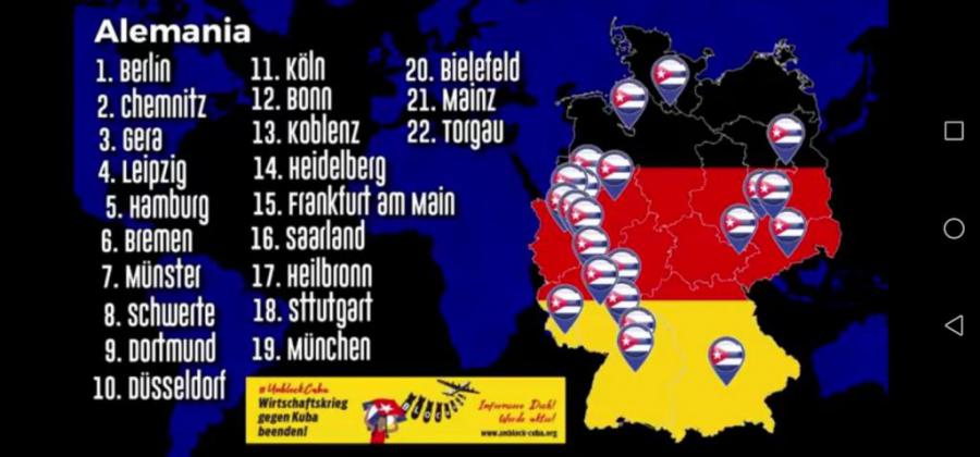 En la capital federal Berlín, la antigua capital Bonn, actualmente sede de importantes organizaciones internacionales, así como en otras seis ciudades que son capitales de sus Estados Federados: Bremen, Düsseldorf, Hamburgo, Mainz, München y Stuttgart, y en la capital financiera de Europa Frankfurt am Main, se realizaron manifestaciones, actos o conciertos en apoyo a la isla socialista, manteniendo las medidas contra la pandemia. La manifestación de Berlín fue realizada en la simbólica plaza frente a la Puerta de Brandenburgo, ocasión en que se realizó una cadena humana frente a la Embajada de los Estados Unidos, portando carteles y banderas cubanas.