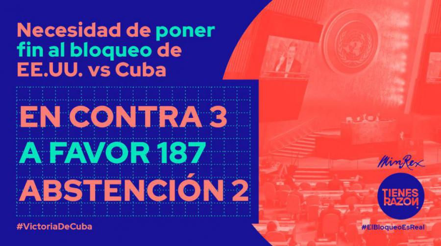 Naciones Unidas, 7 de noviembre de 2019.- Como cada año, Cuba obtuvo una contundente victoria en la ONU, tras ser aprobado el proyecto de resolución contra el bloqueo de Estados Unidos a la isla, con 187 votos a favor, 3 en contra y 2 abstenciones.
