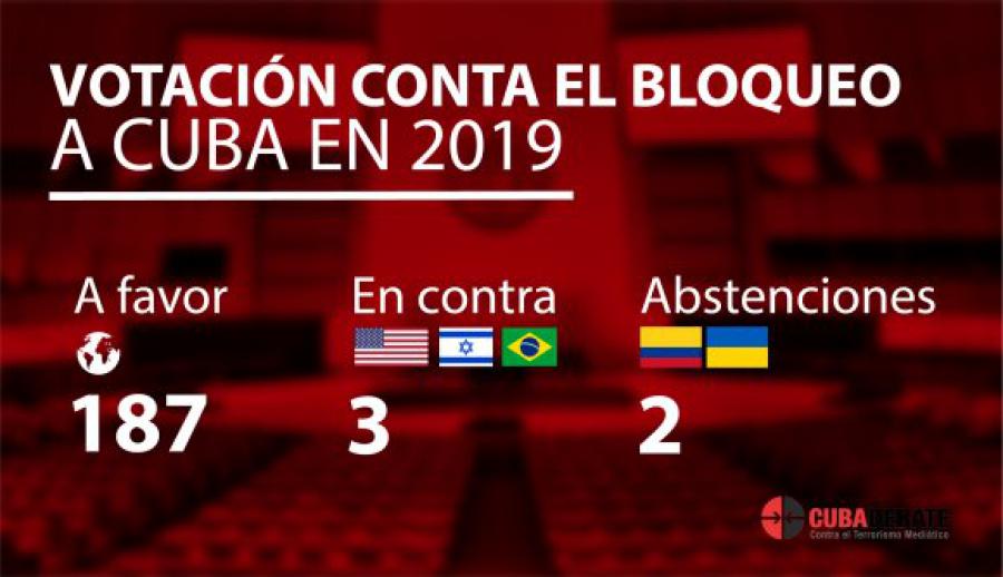 Como cada año, Cuba obtuvo una contundente victoria en la ONU, tras ser aprobado el proyecto de resolución contra el bloqueo de Estados Unidos a la isla, con 187 votos a favor, 3 en contra y 2 abstenciones.