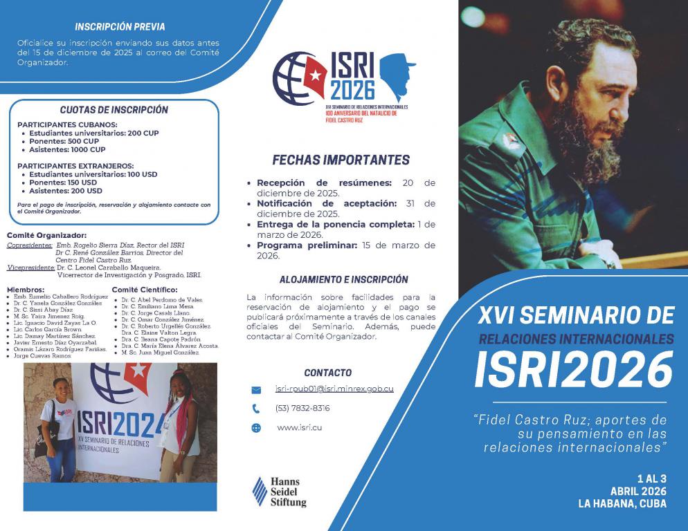 La Habana, Cuba. El Instituto Superior de Relaciones Internacionales "Raúl Roa García" (ISRI) y el Centro “Fidel Castro Ruz" invitan a diplomáticos, académicos, investigadores, profesores, estudiantes y profesionales de las relaciones internacionales a participar en el XVI Seminario Internacional de Relaciones Internacionales, ISRI 2026. Este evento presencial, que esta vez se celebrará en el marco del centenario del natalicio del Líder Histórico de la Revolución Cubana, Fidel Castro Ruz, extiende la invitación a activistas, conocedores y admiradores del pensamiento de Fidel, que se desempeñen en otros segmentos sociales.