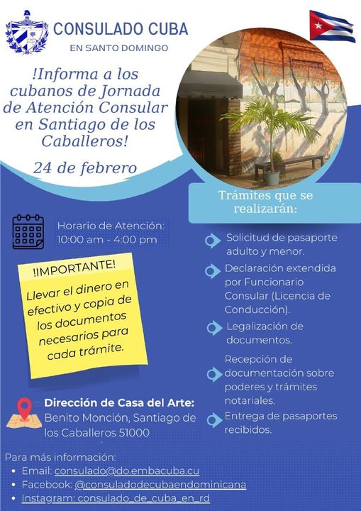 Atención a la comunidad cubana: Sábado 24 de febrero estaremos realizando Consulado Itinerante en Santiago de los Caballeros y actividad cultural a las 6: 30 pm en el Museo del Son. Te esperamos!!!!!