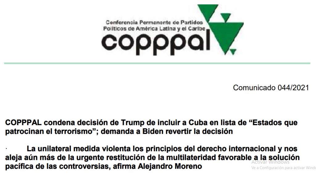 Ciudad de México, 13 de Enero.- La Conferencia Permanente de Partidos Políticos de América Latina y el Caribe, condenó de manera enérgica la arbitraria decisión de Donald Trump de incluir a Cuba como un país patrocinador del terrorismo, acción contraria al derecho internacional y violatoria de los principios de las Naciones Unidas.