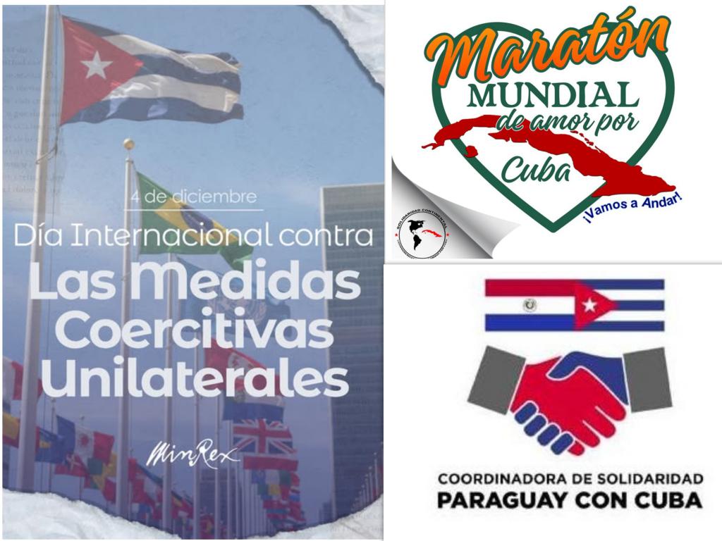Asunción, Paraguay. La Embajada de Cuba en Paraguay se suma a la declaración de nuestra Cancillería, que resalta la relevancia de que el mundo celebre hoy 4 de Diciembre, por primera vez, el Día Internacional contra las Medidas Coercitivas Unilaterales. Y al hacerlo, se deja constancia del agradecimiento sincero a las diversas organizaciones de la sociedad civil del Paraguay, que durante varios años consecutivos han venido pronunciándose contra la implementación abusiva, cruel y desproporcionada de ese tipo de medidas por el Gobierno de los EEUU contra Cuba. En tal sentido, han emitido declaraciones por el levantamiento incondicional del bloqueo genocida que limita el desarrollo del país y es el principal obstáculo al pleno respeto de los DD.HH. del pueblo cubano.