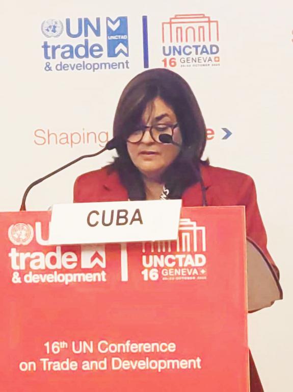 Ginebra, 22 de octubre de 2025. Al intervenir hoy en el debate general de la XVI Conferencia de las Naciones Unidas sobre Comercio y Desarrollo (UNCTAD16), que se está realizando en esta sede, la jefa de la delegación cubana y viceministra de comercio exterior e inversión extranjera, Déborah Rivas Saavedra, alertó que sin una profunda reforma del orden internacional, para millones de personas, sobre todo en el Sur, la posibilidad de un futuro digno seguirá siendo una utopía. “Los pueblos necesitan menos injerencia y más solidaridad; menos intercambio desigual y más equidad”, recalcó.