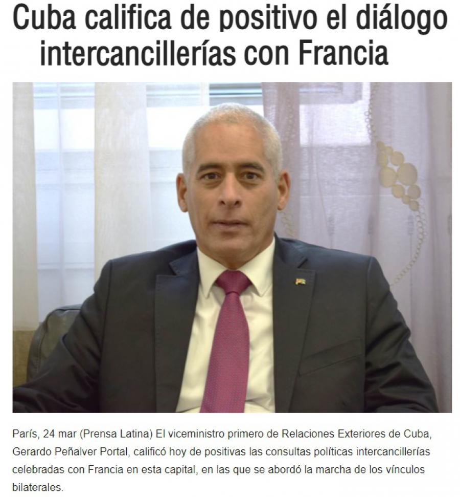 París, 24 mar (Prensa Latina) El viceministro primero de Relaciones Exteriores de Cuba, Gerardo Peñalver Portal, calificó hoy de positivas las consultas políticas intercancillerías celebradas con Francia en esta capital, en las que se abordó la marcha de los vínculos bilaterales.