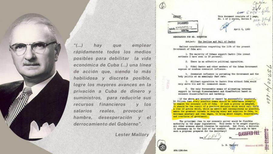 El 6 de abril de 1960, el entonces subsecretario adjunto del Departamento de Estado norteamericano, Lester D. Mallory, escribió un memorando interno que proponía negar dinero y suministros a Cuba, disminuir sus salarios y provocar hambre y desesperación en extremo.