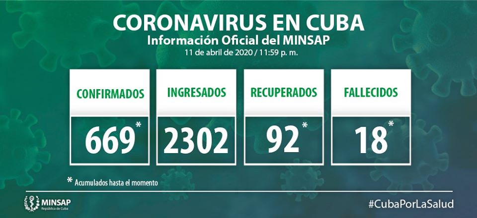 Al cierre del día de ayer, 11 de abril, se encuentran ingresados en hospitales para vigilancia clínico epidemiológica 2 mil 302 pacientes. Otras 8 mil 348 personas se vigilan en sus hogares, desde la Atención Primaria de Salud.