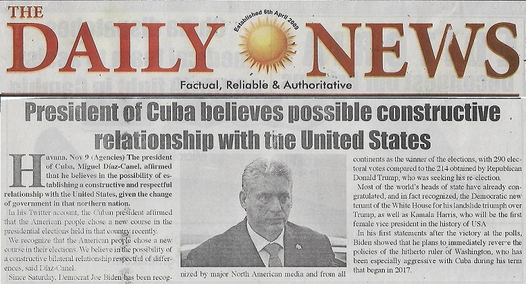En su edición impresa, el referido rotativo de esta nación del occidente africano cita un tuit del presidente de la mayor de las Antillas, Miguel Díaz-Canel, en el cual señaló que reconocemos que en los comicios del 3 de noviembre el pueblo estadounidense optó por un nuevo rumbo.