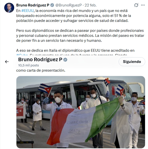 Asimismo denunció que a pesar de que en Estados Unidos solo el 51 por ciento de la población puede acceder y sufragar servicios de salud de calidad, sus representantes se «dedican a pasear por países donde profesionales y personal cubano prestan servicios médicos» con la intensión de «tratar de poner fin a un servicio tan necesario y humano».