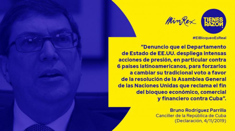 Naciones Unidas, 4 de noviembre de 2019.- El canciller de Cuba, Bruno Rodríguez, denunció hoy que las autoridades de Estados Unidos despliegan acciones de presión y chantaje de cara a la próxima votación sobre la resolución que pide el fin del bloqueo norteamericano.