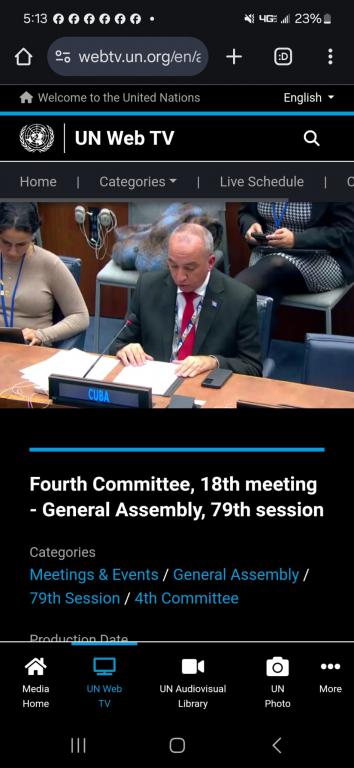 La posición de la Mayor de las Antillas fue destacada por el Embajador Ernesto Soberón Guzmán, Representante Permanente de Cuba ante las Naciones Unidas, durante su intervención, esta tarde, en el debate sobre Cuestiones relativas a la información de la Comisión Política Especial y de Descolonización de la Asamblea General.