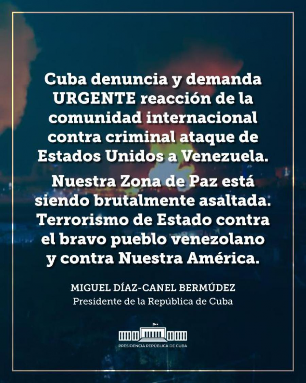 La Habana exigió una reacción urgente de la comunidad internacional ante lo que describió como un “criminal ataque” que atenta contra la estabilidad de la región y vulnera los principios de la Zona de Paz proclamada por América Latina y el Caribe. “Nuestra Zona de Paz está siendo brutalmente asaltada.