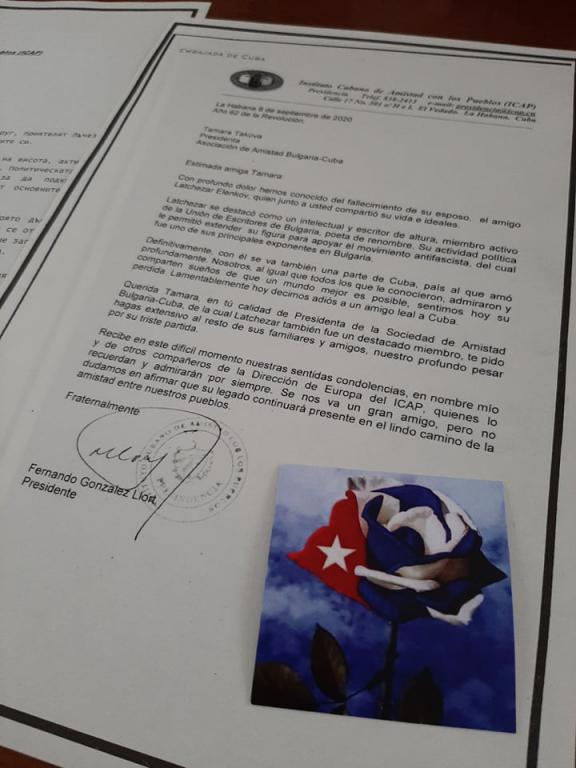 Querida Tamara, en tu calidad de Presidenta de la Asociación de Amistad Bulgaria-Cuba, de la cual Latchezar también fue un destacado miembro, te pido hagas extensivo al resto de sus familiares y amigos, nuestro profundo pesar por su triste partida.