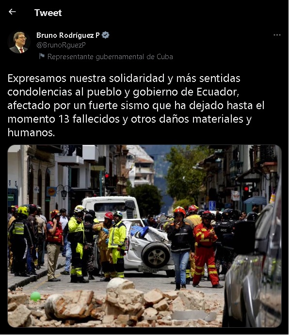 La Habana, 19 de marzo de 2023.- El canciller de Cuba, Bruno Rodríguez, expresó hoy la solidaridad de su país al pueblo y Gobierno de Ecuador, tras el fuerte sismo que dejó hasta el momento 13 fallecidos y otros daños materiales y humanos.