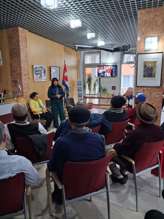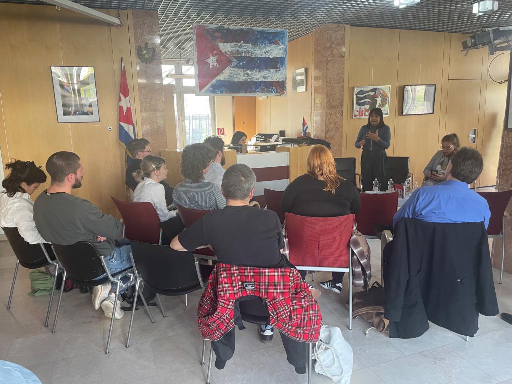 Como parte de su programa, la viceministra sostuvo un encuentro con representantes de la comunidad de cubanos residentes en Alemania, con quienes dialogó sobre la realidad nacional, las oportunidades de vinculación con su país de origen y el papel que pueden desempeñar en el desarrollo de Cuba.