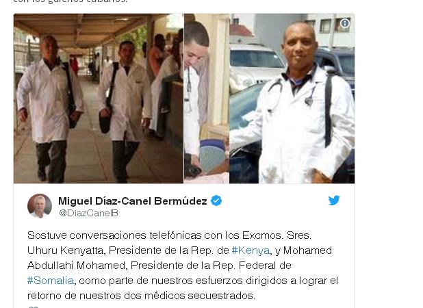 «Sostuve conversaciones telefónicas con los Excelentísimos Sres. Uhuru Kenyatta, Presidente de la República de Kenya, y Mohamed Abdullahi Mohamed, Presidente de la República Federal de Somalia, como parte de nuestros esfuerzos dirigidos a lograr el retorno de nuestros dos médicos secuestrados», anunció desde su cuenta en Twitter el Presidente de los Consejos de Estado y de Ministros, Miguel Díaz-Canel Bermúdez.