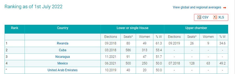De acuerdo con un reporte divulgado recientemente por la UIP, con motivo del Día Internacional del Parlamentarismo, cinco naciones alcanzan paridad de género o una mayor proporción de mujeres en su cámara baja o única en 2022: Ruanda (61,3%), Cuba (53,4%) y Nicaragua (51,7%) ocupan los tres primeros puestos, respectivamente; mientras que México (50,0%) y Emiratos Árabes Unidos (50,0%) comparten el cuarto escaño, al cierre de junio del presente año.