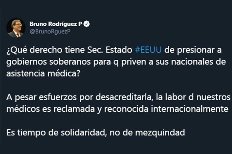 A través de la red social Twitter, el ministro de Relaciones Exteriores cuestionó los recientes señalamientos del funcionario estadounidense quien acusó al Gobierno de la isla caribeña de 'explotación de los trabajadores médicos'.