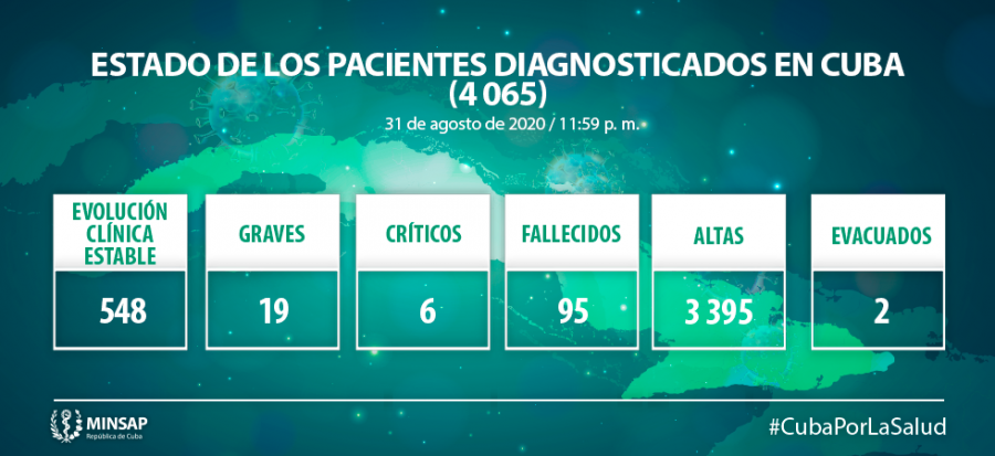 - Mario Bejerano Godoy, cubano, 66 años. Procede del Municipio Marianao. Provincia La Habana. Contacto de caso positivo. PCR realizado el día 22 de agosto. Confirmado. Fecha de inicio de los síntomas. Asintomático. Fecha de ingreso el día 23 de agosto. Fecha de ingreso en Terapia Intensiva el día 28 de agosto. Antecedentes Patológicos Personales. Hipertensión Arterial y Diabetes Mellitus. Se encuentra en el día 8 de evolución y el día 3 en Terapia Intensiva. Gasometría con alcalosis metabólica ligera. Ionograma con hipopotasemia en fase de corrección. Rx tórax. Sin modificaciones, lesiones inflamatorias bibasales. Reportado de grave.