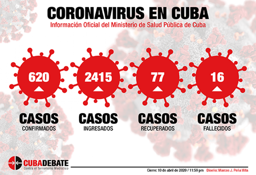Con la confirmación al cierre del viernes 10 de abril de 56 nuevos casos con la COVID-19, Cuba alcanza la cifra de 620 pacientes positivos a la enfermedad causada por el coronavirus SARS-CoV-2, informó esta jornada el doctor Francisco Durán García, director nacional de Epidemiología del Ministerio de Salud Pública (Minsap).
