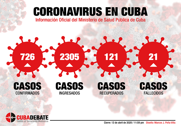 Con la confirmación al cierre del domingo 12 de abril de 57 nuevos casos con la COVID-19, Cuba alcanza la cifra de 726 pacientes positivos a la enfermedad causada por el coronavirus SARS-CoV-2, informó esta jornada el doctor Francisco Durán García, director nacional de epidemiología del Ministerio de Salud Pública (MINSAP).