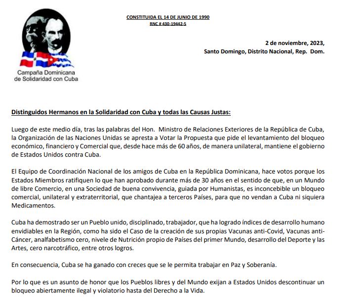Luego de este medio día, tras las palabras del Hon. Ministro de Relaciones Exteriores de la República de Cuba, la Organización de las Naciones Unidas se apresta a Votar la Propuesta que pide el levantamiento del bloqueo económico, financiero y Comercial que, desde hace más de 60 años, de manera unilateral, mantiene el gobierno de Estados Unidos contra Cuba. El Equipo de Coordinación Nacional de los amigos de Cuba en la República Dominicana, hace votos porque los Estados Miembros ratifiquen lo que han aprobado durante más de 30 años en el sentido de que, en un Mundo de libre Comercio, en una Sociedad de buena convivencia, guiada por Humanistas, es inconcebible un bloqueo comercial, unilateral y extraterritorial, que chantajea a terceros Países, para que no vendan a Cuba ni siquiera Medicamentos. Cuba ha demostrado ser un Pueblo unido, disciplinado, trabajador, que ha logrado índices de desarrollo humano envidiables en la Región, como ha sido el Caso de la creación de sus propias Vacunas anti-Covid, Vacunas antiCáncer, analfabetismo cero, nivele de Nutrición propio de Países del primer Mundo, desarrollo del Deporte y las Artes, cero narcotráfico, entre otros logros. En consecuencia, Cuba se ha ganado con creces que se le permita trabajar en Paz y Soberanía. Por lo que es un asunto de honor que los Pueblos libres y del Mundo exijan a Estados Unidos descontinuar un bloqueo abiertamente ilegal y violatorio hasta del Derecho a la Vida.