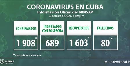 Cubasí, 21 de Mayo 2020. Al cierre del día de ayer, 20 de mayo, se encuentran ingresados en hospitales para vigilancia clínica epidemiológica 689 pacientes. Otras 1 mil 697 personas se vigilan en sus hogares, desde la Atención Primaria de Salud.